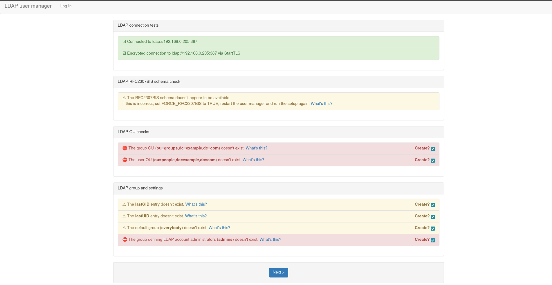 You can click next and then the create administrator button on the following page. Create your account and you will be brought to the LDAP Account Manager user list page.